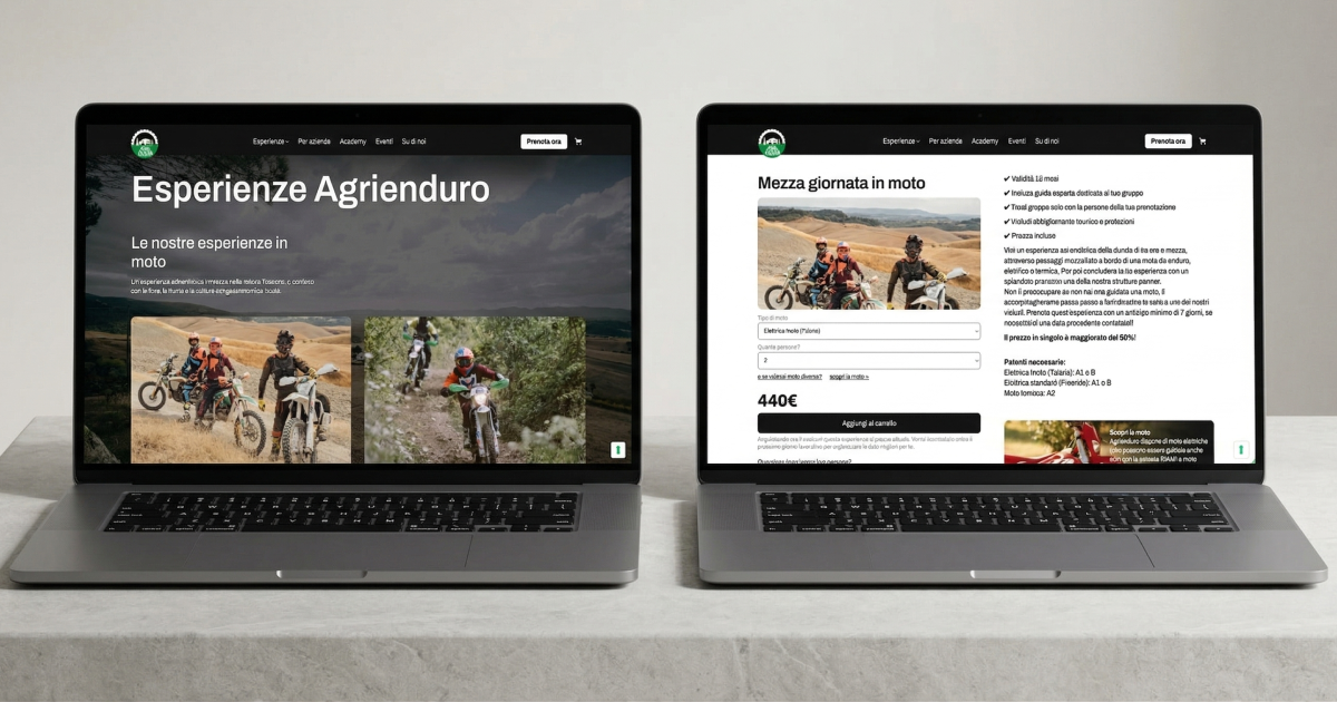 Progettazione del sito web ed e-commerce per Agrienduro. Un'architettura digitale ottimizzata per la prenotazione di esperienze in moto per novizi ed esperti.