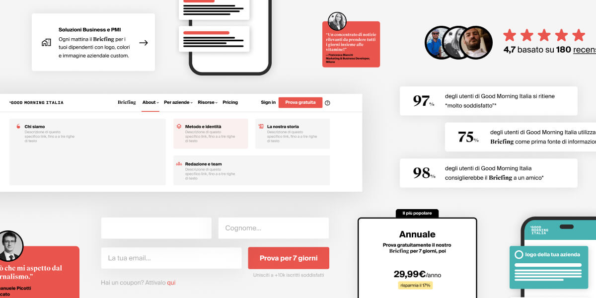 Il progetto per Good Morning Italia nasce dalla necessità di allineare l'infrastruttura digitale alla qualità del loro servizio editoriale. In un contesto di sovraccarico informativo, il loro servizio consiste in aggiornamenti quotidiani estremamente rapidi, curati da una redazione ad hoc. Come studio, il nostro compito è stato quello di costruire un sito e dei contenuti in grado di facilitare l'acquisizione di nuovi clienti, incontrando l'interesse di quelle persone che più avrebbero beneficiato dei servizi proposti.